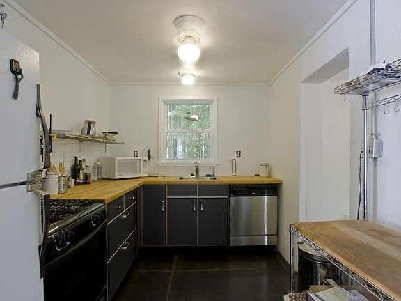 1940's updated farm house. One bedroom home with flex space off master upstairs. Flagstone floors in living, steel floors under FLOR carpet squares in dining/ kitchen. Open floor plan with plenty of windows and light. The park-like backyard has a creek crossing the yard. Back has workshop, storage shed, chicken coop. Equally great for entertaining or lots of privacy.
