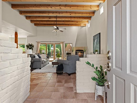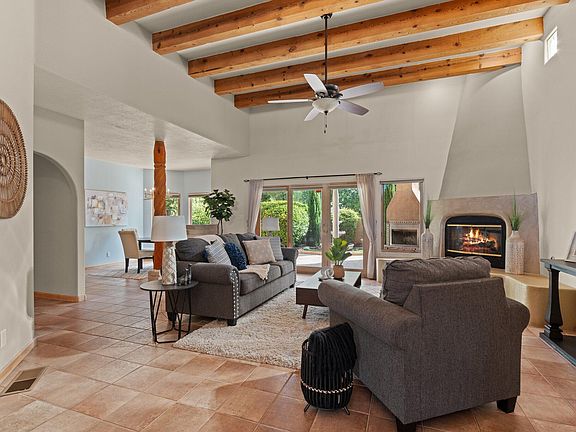 Welcome to The Meadows on Rio Grande! This home features 3 bedrooms, a study, a great room with a gas log fireplace. The second living room, which could serve as a formal dining room, has a built-in hutch and sliding glass doors to the courtyard. The updated kitchen boasts a large island with a built-in sink for food preparation and a walk-in pantry. The laundry room leads to a workshop and a large walk-in storage closet. The primary bedroom offers an en-suite bath with double sinks, jetted soaking tub, separate shower, and a walk-in closet. Outdoor living is a highlight of this home. The upstairs deck offers views of the Sandia's and spectacular fireworks shows. The back patio is perfect for entertaining, featuring a built-in fireplace, a beautiful water fountain, and a built-in grill.