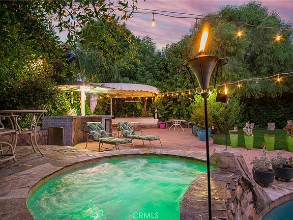 The haven continues outdoors, where a truly private backyard reveals a host of amenities. Delight in the expansive pool and jacuzzi area, accentuated by stamped and stained concrete, a protective patio cover, and a serene grassy expanse. A built-in BBQ, fueled by a propane tank, complements the outdoor experience. Solar water heating adds to the environmentally-conscious amenities.