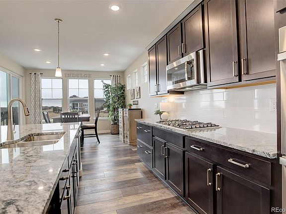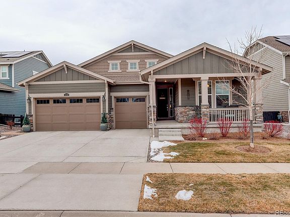 Like new walk out ranch with a full finished basement backing to open space with stunning mountain views! Beautifully finished with extensive wood laminate flooring on both levels, 9 foot ceilings & 8 ft doors, custom lighting throughout, all new interior paint & carpet. Big gourmet kitchen with modern espresso cabinetry featuring a huge center island with single slab granite countertop and pendant lighting, smart appliances, a corner pantry & a spacious dining area. The kitchen flows effortlessly into the inviting family room with charming custom stone fireplace flanked by floating shelves creating warmth and elevated style. The spacious primary suite is a quiet reprieve at the end of the day with a spa-like bath that offers dual sinks & a massive two person shower. The huge primary closet has built in island storage & conveniently connects to the multipurpose laundry room/pocket office. Convenient mudroom, dedicated home office with French doors, a 3rd full bath and a private guest suite with en-suite bath round out the first floor. The full finished basement is equally as impressive as the main! On this level you will find a large 3rd Bedroom & adjacent full bath with custom vanity & European walk in shower. A spacious second living area that is flooded with natural light from the big picture windows & an impressive built in wet bar with large island (could easily be converted to full second kitchen) flanked by a dining/poker room create a perfect space for entertaining family and friends. Finally, there is a home gym, a bonus multipurpose room that could be a non conforming 4th bedroom or craft room & 2 separate storage areas. No shortage of space or possibility in this home! The backyard is the true “wow” factor of this home. Low maintenance turf yard is beautifully landscaped & overlooks lush open space with picturesque mountain views beyond. Whether enjoying the upstairs covered deck or the hot tub on the patio below, experience million dollar views everyday!