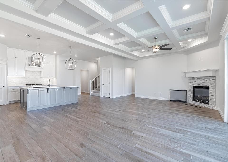 This Mallory Bonus Room floor plan includes 2,955 Sqft of total living space, which features 2,640 Sqft of indoor living space and 315 Sqft of outdoor living space. There is also a 630 Sqft, three-car garage with an in-ground storm shelter installed. This magnificent home offers 4 bedrooms, 3 full baths, covered patios, a utility room, and a large bonus room. The great room presents a beautifully detailed coffered ceiling that extends to the dining room, a gas fireplace with a stacked stone surround detail, wood-look tile, rocker switches throughout, Cat6 wiring, and a luxurious 3-panel sliding door with a 4’ back patio extension. The kitchen has stainless steel appliances, a 5-burner cooktop, decorative tile backsplash, 3 CM countertops, a center straight island with a work station sink and a trash can pullout installed, a large corner pantry, pendant lighting, and custom cabinetry to the ceiling with cabinet hardware installed throughout. The prime suite features a sloped ceiling detail with a ceiling fan, our cozy carpet detail, Cat6 wiring, and windows. The attached prime bath holds a dual sink vanity with framed mirrors, tile flooring, a European style walk-in shower, a free-standing tub, a private water closet, and a walk-in closet. Secondary bedrooms feature high ceilings with a ceiling fan, windows, spacious closets, and carpeted flooring. The covered outdoor living holds a wood-burning fireplace, a gas line, and a TV hookup. Other amenities include healthy home technology, a tankless water heater, R-44 insulation, and so much more!