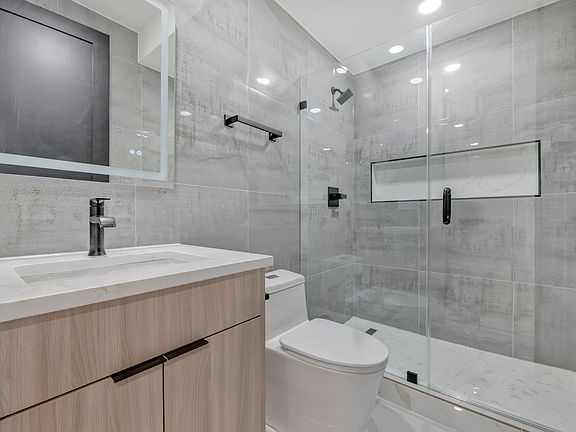 Modern fully equipped kitchen with stainless steel appliances, including a stove, microwave, dishwasher, and a sleek, minimalist design. Step into a beautifully tiled bathroom with a glass-enclosed shower, modern fixtures, and LED mirror lighting.