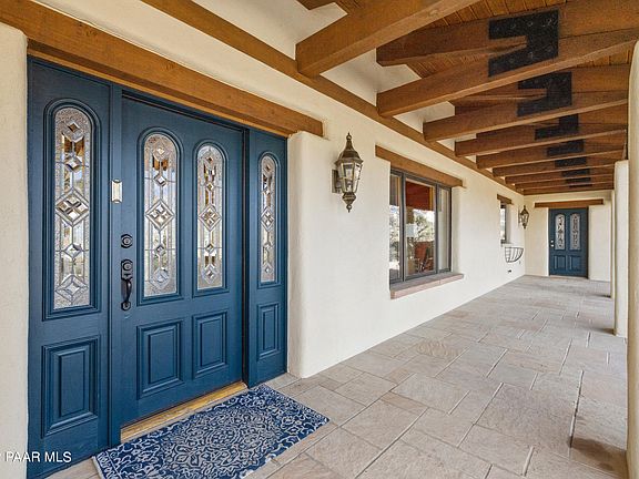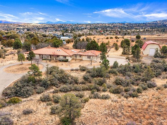 Sweeping views of the snowy San Francisco Peaks by day and the sparkling Milky Way by night await you from your stunning ranch style home in peaceful Williamson Valley. This incredible custom home features towering wood ceilings with breathtaking skylights, exposed beams, and three stunning fireplaces. A gorgeous courtyard framed by flowering cherry trees, apple trees, a luscious lawn, and tons of space for entertaining . The open concept kitchen has stone countertops, two stoves, counter seating for four, and a designated coffee/wine bar with its own sink. Plenty of room for everyone with an enormous primary bedroom with access to both the courtyard and its own private deck with incredible views. A second primary with full ensuite, two more generous bedrooms, and a separate