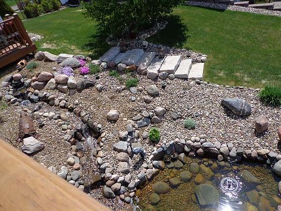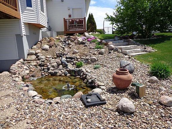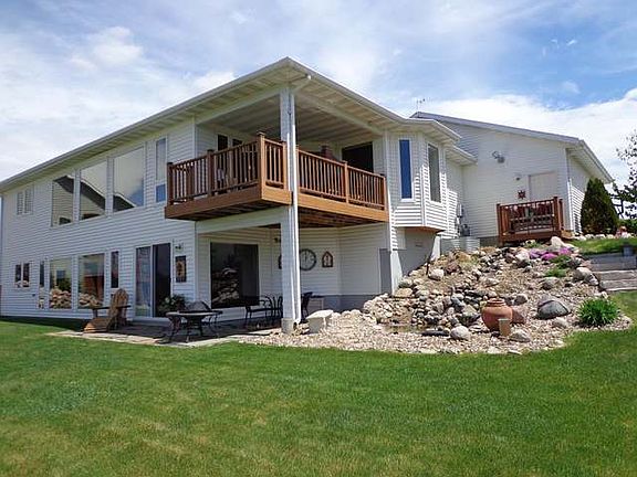 Must see the breathtaking views from this very impressive home located on a quiet cul-de-sac near Fort Lincoln Elementary school.Relax and enjoy the sunset from the maintenance free deck while you are looking over the beautiful landscaped yard and listening to the water flow in your Koi pond. Custom built in 2003 with open floor plan, high vaulted ceilings,6 panel doors throughout,hickory floors on main level,two sided fireplace, large kitchen with alder cabinets, and main floor laundry. Large custom windows on both levels let you enjoy the fantastic view from almost anywhere in the house.The master bedroom features walk in closet,and full bath with Victorian style claw foot tub. Master suite and stairs have new carpet, and main level is recently painted. Recessed lighting in living room,dining room, kitchen, breakfast nook, and hallway.Walkout lower level has gas line stubbed in for add'l fireplace.Triple attached garage is insulated, heated, floor drain and hot and cold water.