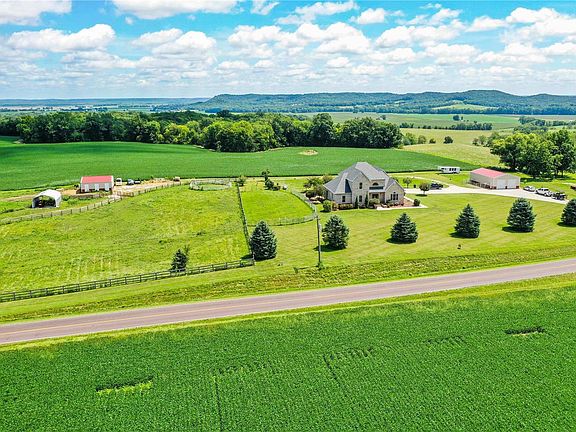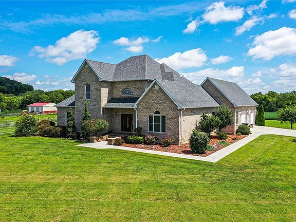 INCREDIBLE custom country estate on 7 ACRES situated in a quiet rural community. INCREDIBLE SCENIC VIEWS from every window. Soaring 2-story entry foyer. Great room floor-to-ceiling fireplace, double French doors to patio, CHERRY HARDWOOD FLOORS THROUGHOUT, recessed lighting, arched doorways. GOURMET CUSTOM KITCHEN with 58-in cherry cabinets, glass accents, crown molding, custom mosaic backsplash, GRANITE countertops, HIGH-END *VIKING* STAINLESS STEEL APPLIANCES, gas cooking, breakfast bar, 2nd sink. Humongous MAIN LEVEL MASTER SUITE with luxury STONE TILE, jetted tub, dual granite/vessel vanity, oversized step-in tiled shower, DOUBLE CLOSETS, private door to BRICK PATIO & relaxing decorative pond. 3 out of 5 bedrooms each have their own PRIVATE EN-SUITE BATH! Walkout LL features rough-in bath for easy future finish. Efficient Bosch GEOTHERMAL systems! Home has BRAND NEW ROOF! Large metal outbuilding has concrete floor, electric & water.