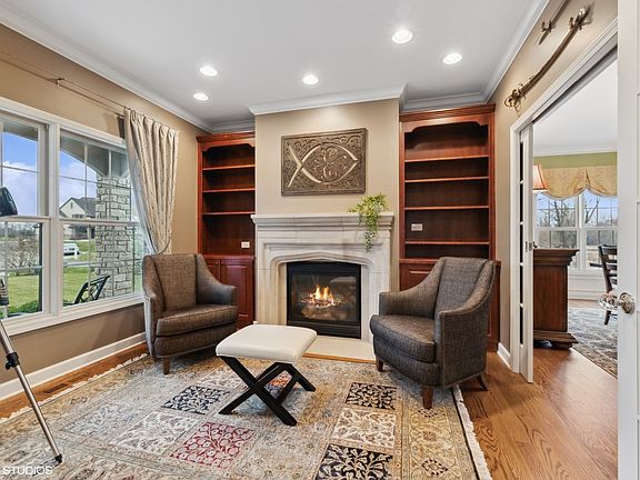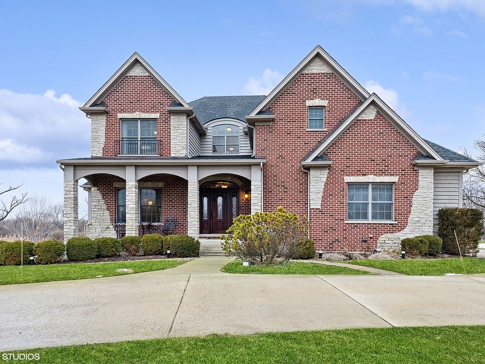 This marvelous masterpiece is truly custom in every way. Stone and brick exterior with stone columns and covered porch. Circular concrete driveway. Hardwood floors throughout main and second floor. FOUR fireplaces & 3 are two-suded! 9+' ceilings on all three levels. Gorgeous millwork, French doors, French pocket doors, custom doors with crystal knobs, hardwood staircase with iron balusters, magnificent light fixtures throughout. High-end kitchen boasts creamy glazed custom cabinetry with antique nickel hardware and task lighting, Electrolux Icon stainless appliances, six-burner gas range with two ovens, seed glass display cabinet in butler's pantry, customized walk-in pantry with tray storage, clear front drawers, & towel racks, statement island with stainless Dacor exhaust and suspended glass bowl lights, limestone fireplace, and sunny dining area overlooking natural conservancy and wraparound deck. Large family room with mount for TV over fireplace, lighted ceiling fan, and direct access to large sunporch with paddle fans, skylights, and arched windows. Private study features limestone fireplace, bookcases, recessed lights, and French pocket doors to dining room. Columns punctuate arched entry to dining room with panel frame molding and bay window. This drop zone will be the envy of all your guests with its slate floor, utility sink, four floor-to-ceiling cabinets for coats/backpacks with lower cabinets for shoes & boots and door to sunporch. Pretty powder room with chest-style vanity, hand-carved framed mirror, candle sconces with shades, custom wall treatment, and white commode. Climb the custom oak staircase with scroll motif chandelier overhead and behold the dynamite second floor. Primary suite with two-sided white millwork and stone tile surround fireplace, tray ceiling with cove lighting, skylight, mount for TV, crown molding, customized walk-in closet, and terrific stone tile bath with fireplace, jetted tub, two cherry vanities, separate shower, and water closet with door and linen closet. Private suite with cherry vanity, white tub/ shower with handheld spray, and brushed nickel hardware. Bedrooms 3 & 4 share Jack & Jill bath with separate tub/commode room, double vanity and offer generous custom closets. Big laundry room with lots of cabinets, hanging rod, closet and access to full-height attic completes the second floor. Massive walkout with full kitchen with conversation height counter with seating, two-sided brick fireplace, full bath, game/ rec area, BR/den, mega storage & mechanicals room, and atrium doors to lower patio with hot tub ("as is"). Zoned HVAC with one new furnace and humidifier in 2022. New dishwasher. Water filtration system. Side-load 3+ car garage with alcove for storage or workshop. Marvin windows and Anderson glass doors. Please exclude dining room chandelier.