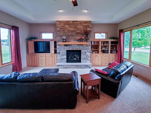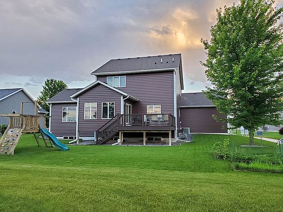 Home features an entryway with 10ft ceiling stepping up to a large great room with stone fireplace, maple built-ins, large windows, and an 11ft ceiling. The open floorplan leads to a dining room and then to the massive kitchen, featuring custom cabinetry and stainless-steel appliances. Next to the dining room is the sunroom, with doors leading out to the large maintenance free deck. The main floor also features a ½ bath, office, mud room with cubbies and two closets, as well as a laundry room featuring additional custom cabinetry. Upstairs holds the master bedroom with private bath, custom tiled shower, and large walk-in closet. Also on the second level are two additional bedrooms and another bathroom. The lower level features a large family room and open area, wet bar, fourth bedroom, bathroom, and a large maintenance/storage room. Attached is an oversized three-stall garage (over 1100 sq ft) with stairs to basement. Meticulously cared for and maintained by current owners.