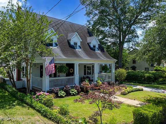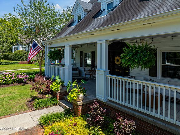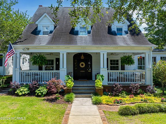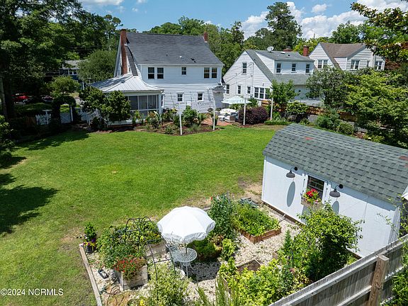 Escape to your private sanctuary in this enchanting Cape Cod home with a backyard retreat situated on a unique double lot in Chestnut Heights near downtown Wilmington and only minutes from Wrightsville Beach. The interior boasts historic character with modern conveniences, featuring beautiful millwork, hardwood floors, and expansive windows that fill the home with natural light as well as a beautiful sunroom. The kitchen and dining room extend from the front of the home to the back, providing a spacious and functional layout. The rest of the first floor offers relaxing living space, with a large living room and an open sunroom leading to a covered porch. Step onto the wrap-around rocking chair front porch, or enjoy the screened-in porch with high ceilings that overlook the lush, private backyard. The outdoor areas also include an outdoor shower, a brick patio perfect for entertaining, and a large storage shed. Upstairs, you'll find two bedrooms and the primary suite, which includes a renovated bath with a walk-in shower, soaking tub, dual vanity sinks, walk-in closet, and cedar closet. The double lot provides two off-street parking spaces, a large side yard, and a retreat-like backyard with a garden area.