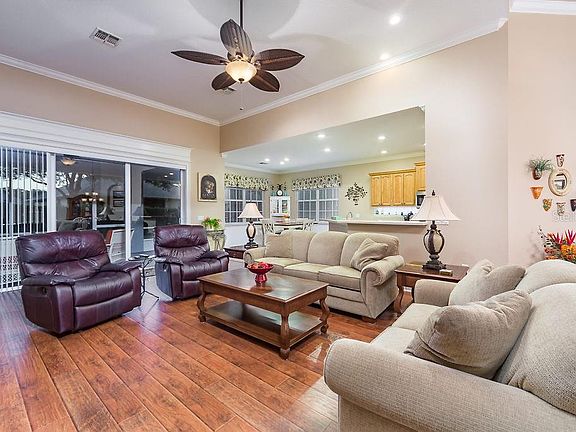 IT'S A NO-NO! No Painting, No Fixing, no Yard Work in this convenient MAINTENANCE FREE, 55 and older community. Lake James Subdivision is a ERNIE WHITE community, a local custom builder with outstanding merit. Enter subdivision with brick paved gated entry. The community features meandering walk/bike trails, 8 ac lake w/community dock, clubhouse with heated pool and fitness room. Enter home with stunning foyer with decorative step tray ceiling and cornice of crown molding that frames front door. OPEN GREAT ROOM SHARES FORMAL DINING ROOM, great for entertaining a crowd. Newly installed chocolate color wood floors with neutral colored walls. Spacious enough dining room plenty of room for buffet or china cabinet. FAMILY ROOM and kitchen combination is perfect for the cook who does not want to be separated from family and guest. Built in TV cabinet with additional storage and plenty of room for collectables. Wall to wall sliding glass doors that open to enclosed lanai, brings the outside inside. RECIPE FOR SUCCESS... Efficient style plus inviting warmth of open kitchen with plenty of counter space, corian countertops, 42" cabinets, tile backsplash, closet pantry and all appliances included. Well thought of glass walled inserts that allows the flow of natural light within kitchen area. Butler's Pantry OR Coffee/Drink bar, added touch for entertaining needs. MASTER SWEET! with large master bath to spoil you, separate shower, his/her sinks and HUGE Walk in closet. French doors opens to separate den/study.