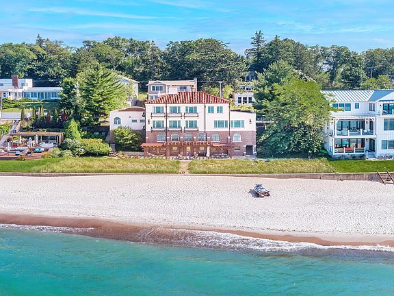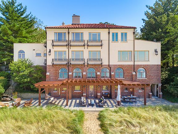 Casa del Lago: This Mediterranean-inspired California resort style home offers a rare mix of 130 feet of Lake Michigan frontage, distinctive craftsmanship and timeless elegance. Originally built as the summer residence of Dr. William Scholl, famed "Foot Doctor to the World," the home reflects an era of gracious estate luxury. Reimagined under the direction of acclaimed architect Howard Holtzman, and carefully maintained since then, Casa del Lago blends historic character with refined updates. From Lake Shore Drive, this iconic residence presents a graceful two-story profile, while from the lakeside its true grandeur is revealed -- four dramatic levels with expansive windows framed by wrought-iron balconets, a striking timber-frame pergola, a dune grass meadow, and a wide sandy beach along the Lake Michigan shoreline.The interior proudly exhibits historical architectural features of richly carved corbels, Venetian plaster walls, stylish hardware, and a limestone fireplace carved with lions' heads and the Latin phrase "not too near - not too far," a nod to the proximity to Chicago. The home is a showcase of custom walnut millwork, bespoke cabinetry, beamed ceilings and vintage lighting fixtures. From all levels, enjoy panoramic views that stretch from the Chicago skyline to the Michigan dunes. On the main level, a true cook's kitchen opens to a lakeside great room for more intimate dining with a casual living space, while the expansive living room and lakeside dining room accommodate larger gatherings/parties. The top-floor primary suite is a sanctuary, featuring dual hand-crafted tile and stone baths, a walk-in closet, a dressing room, private study, sitting room and a serene rooftop deck. Additional amenities elevate the experience, including splendid guest quarters, a fitness room, wine cellar and a lakefront terrace made for gathering, with room for outdoor dining, lounging, firepit and games, all with direct access to a low bluff beach. Owner has RE license.