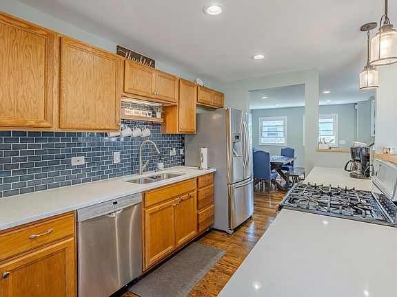 Welcome home! Enjoy this 3 bedroom 2 full bath house on a quiet tree lined street close to all Rolling Meadows has to offer! Walk to shopping, schools and parks. The main floor offers hardwood floors and an open concept. The kitchen has stainless steel appliances, new backsplash and new quartz countertops. There are 2 bedrooms and a full bath. Head out to your sunroom to enjoy the breezy evenings. The sunroom has natural gas to heat the room and extend your enjoyment for a longer season. Upstairs you will find an amazing family room with a wood burning fireplace, vaulted ceilings, skylights and a balcony. The main bedroom is extra large with additional storage behind the closets. Throughout the house there are newer windows and furnace. The deep crawl space has been permasealed. There is a new garage complete with air conditioning and a second overhead door leading off the back of the garage as well as a tall attic space for additional storage.