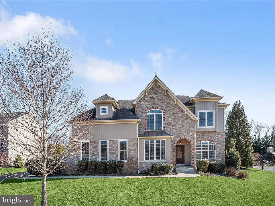 Exquisite French Country/Chateau-Style Home with Elegant Rustic Charm! Formerly a Viking model home, this stunning residence is loaded with builder upgrades and premium finishes. The steeply pitched stone façade and extended stone privacy wall set the tone for timeless elegance. Inside, engineered wood floors and solid core doors with beadboarded texture and bronze hardware add warmth and sophistication. Designed for modern living, the open-plan layout seamlessly connects the spacious family room with a gas fireplace, and adjacent gourmet kitchen with gas cooking, two islands, pantry and beverage cooler. Living and dining formals are complemented by arched windows, crown molding and panel wainscoting, A sunroom off the kitchen brings in natural light, while a private study offers a quiet retreat and work at home space. Thoughtful conveniences include a secondary side entry and built-in cubbies in the mudroom, a finished lower level with a recreation room, game area, full bath, ample storage, and double walk-up stair access. Upstairs, the primary suite is a luxurious escape, boasting a tray ceiling, oversized walk-in closets, and a spa-like bath with dual vanities and soaking tub. Three additional bedrooms include a private ensuite and two bedrooms that share a hall bath. Outdoor living is exceptional with expansive front and rear lawns, a stone privacy wall, basketball hoop, low-maintenance deck with awning, paver dining patio, circular paver fire pit patio, stone garden wall, hot tub, and a dual-entry storage shed. Come home to a one-of-a-kind opportunity with premium craftsmanship and exceptional amenities. Don't miss this masterpiece with builder enhancements and upgrades at every turn!