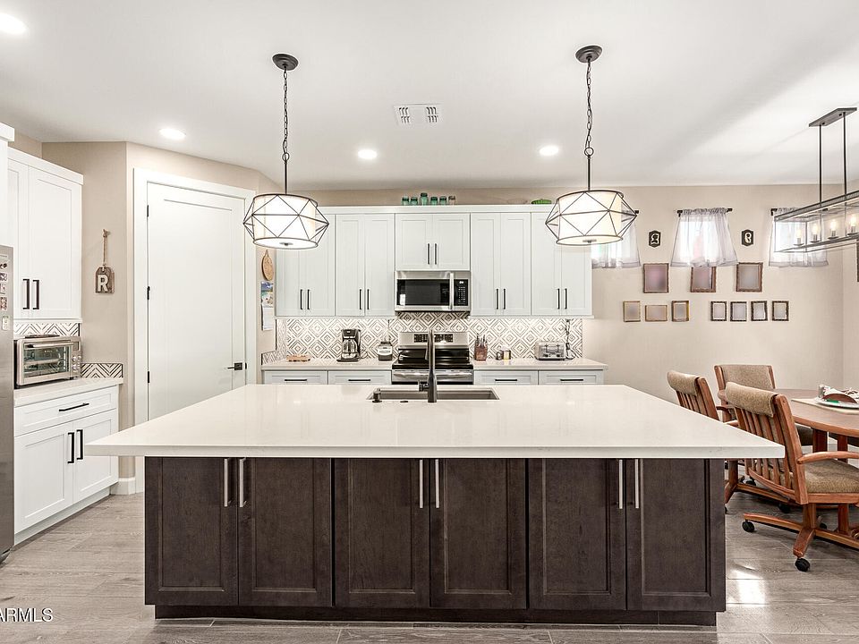 Step into luxury with this beautifully designed open-concept home. This modern residence boasts recessed shaker-style cabinets with soft-close doors and drawers throughout, centered around a spacious kitchen island perfect for entertaining. The quartz countertops feature elegant veined accents, complemented by a large single-basin granite sink. The home features porcelain wood-look tile plank flooring and solid core 8' shaker-style interior doors You'll love the 10' ceilings, crown molding , 4'' base boards, custom backsplash, and the sleek LED under-cabinet lighting with hidden outlets. The SS appliances include a smooth-top induction range and built-in microwave, making meal prep a pleasure. A/C & Heat in Garage. The divine master suite is your personal retreat, featuring a walk-in tile shower with a built-in bench seat and shampoo niche, dual his-and-hers sinks, and an impressive 12-foot walk-in closet.