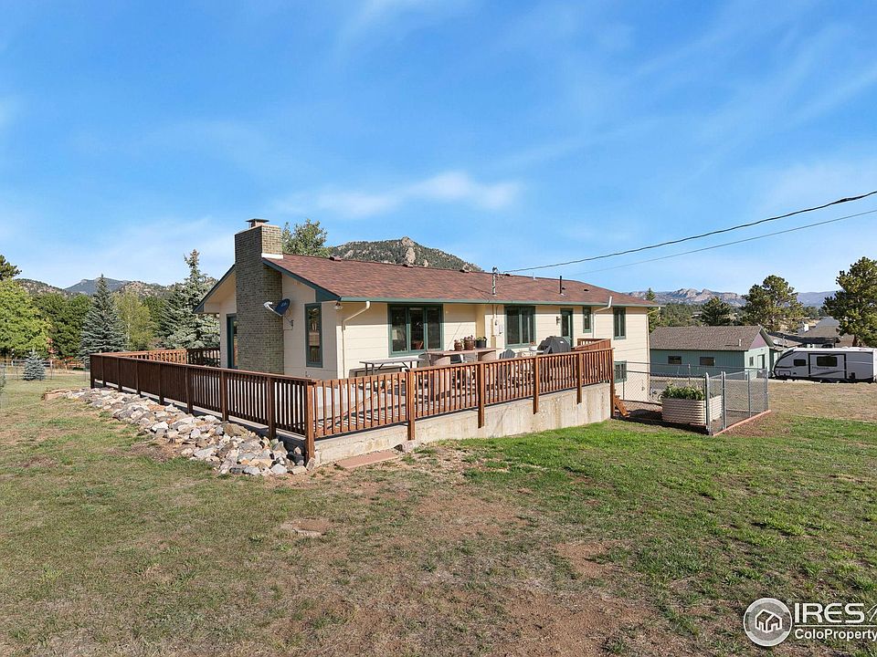 Established amidst the beauty in Estes Park, Colorado, this meticulously maintained, bi-level 3-bedroom, 3-bathroom residence offers the perfect blend of modern comfort and mountain charm. With over 2600 square feet of thoughtfully designed living space, this home is a sanctuary for those seeking tranquility, with plenty of options for entertaining. Step inside, and you'll be greeted by an abundance of natural light that floods the interior, creating a warm and inviting atmosphere. The updated kitchen features sleek stainless steel appliances, quartz countertops, and ample cabinet space. The spacious living room, with floor to ceiling moss rock fireplace and vaulted architecture is the ideal place to relax and unwind or gather with loved ones. Large windows offer beautiful views of the surrounding landscape, and the large concrete deck has multiple access doors to enjoy the outdoor living space. On the main level, you'll find two generously sized bedrooms, each providing a peaceful retreat. The primary suite, complete with a walk-in closet and an en-suite bathroom features a step-in shower. The third bedroom is on the lower level, perfect for guests or family members, with a 3/4 bathroom. One of the standout features of this home is the incredible 400 square foot home theater or rec room. This versatile space is a blank canvas ready for your imagination. Whether you envision a state-of-the-art home theater experience or a cozy family room for game nights and movie marathons, this room offers endless possibilities. Outside, you'll discover a level .89-acre lot that provides ample space for outdoor activities. Enjoy barbequing on the patio, gardening, or simply relaxing in the serene surroundings. The property offers tranquility, while still being conveniently located to all that Estes Park has to offer.