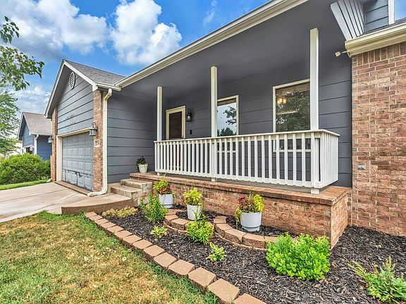 Welcome to Covington Street! This home oozes with charm and is located within the desirable Goddard school district! You’ll enjoy the lure of the front porch, as it invites visitors into an open living space with vaulted ceilings, fireplace and loads of natural sunlight! This main living areas feature a durable, wood look LVP flooring and white trim, while upgrades to the kitchen include granite counters, and refinished cabinetry! Cozy, yet comfortable dining options include both outdoor options: on the upper deck or lower patio or, of course, inside! This home features the popular split bedroom floorplan. Highlights of the main bedroom include vaulted ceilings, walk-in closet, and ensuite bathroom. On the other side of the home are 2 more bedrooms & another full size bathroom. And the property continues to delight downstairs, with view-out windows, spacious family room, additional bedroom, full bathroom and somewhat finished utilitarian/laundry space – for storage, workshop, or whatever you desire! A 2 car garage, large shed and newer AC round out everything this property offers! Located near parks, restaurants and shopping, this home offers both comfort and convenience. Schedule a viewing today and discover your new home!