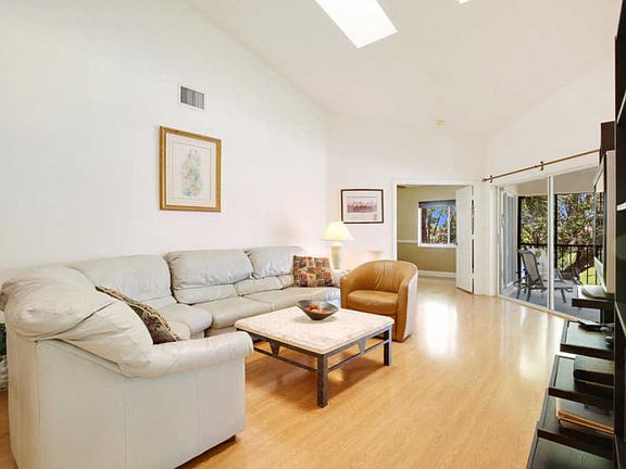 Spacious & bright 2nd floor, end unit coach home with lake views. High ceilings w/skylights add to the open feel. Modernized eat-in kitchen w/white cabinets, granite counters, satin nickel faucet and hardware. Split bedroom plan. Laminate floors throughout upper level. Master suite w/vaulted ceiling has double sinks, separate shower + a soaking tub. Screened balcony w/wood deck is a great place to relax & enjoy peaceful water views. Pet friendly & all ages are welcome here. Monthly fee covers cable, water, insurance, pest control, roof & exterior maintenance, landscaping, pool, fitness & community room. Fabulous central location is walking/biking distance to grocery, BEST boutique gym, restaurants, shops & more. Just minutes to beach, mall, I95 and parks. ''A'' rated schools too!