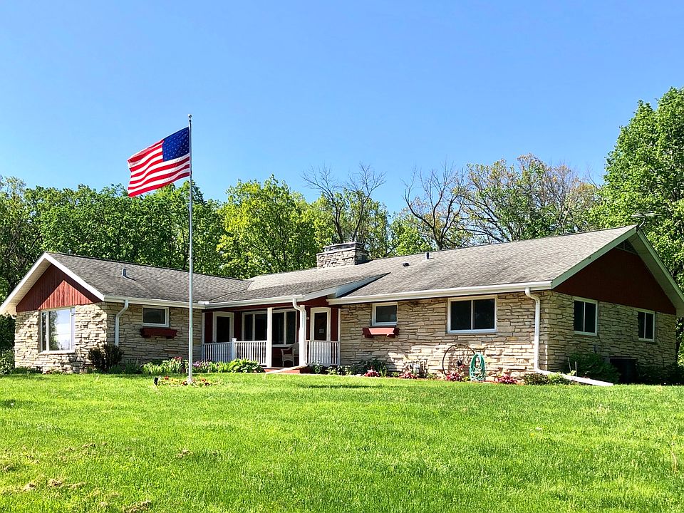 Spacious Lannon stone ranch style home w/large outbuildings & acreage. Home's Mid-Century quality craftsmanship complimented by numerous updates. Polished look of freshly painted interior, warm toned brand-new flooring, refinished gleaming HFs... Wall of windows in LR frame wooded scenic landscape. Watch the seasons unfold in Sunroom. Ample space for living & entertaining on both levels. Walk-out lower level boasts large Rec room, office & second kitchen. Attached 2 car garage. 2 steel outbuildings with concrete floors. 45' x 26' building has insulated, heated area for workshop, storage and additional parking. Huge 72' x 54' pole barn for hobbyist/collector. 8 acres of land for YOU to enjoy as a horse property, gardener's paradise or nature lover's retreat. Move-in ready to be YOURS!