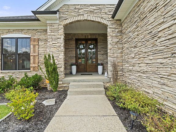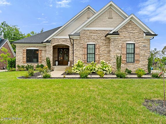 Welcome to 2307 Champion Hill Place, a BETTER THAN NEW, beautifully designed, luxury brick ranch-style home with stone and hardy board accents, nestled on a beautiful lot in the premier and coveted Shakes Run community in Fisherville, KY located near Eastwood in eastern Jefferson County. This home is BETTER THAN NEW..... current owners have upgraded all builder grade light fixtures to designer light fixtures and upgraded some bathroom vanities, added wainscotting to several rooms, added a professionally designed boutique-style custom closet in the Primary Suite, removed builder landscaping an added professionally designed landscaping (front/back/sides), added a wifi controlled Rain Bird sprinkler system (whole yard), a Cafe refrigerator and so much more. This exquisite 4 bedroom, 3 ½ bathroom, ranch home boasts over 5,000 sq ft with a generous over 4,400 square feet of finished living space, offering a perfect blend of luxury and comfort. When you pull in the drive you will appreciate the meticulous and professionally designed landscape with programmable with whole yard sprinkler system to maintain its beauty during the hot summer days. When you enter this exquisite, but inviting home through the charming portico and foyer, you will immediately notice the impeccable custom craftsmanship woven throughout every room. Also noteworthy is the designer lighting, high-end finishes, and architectural details in every corner. An elegant dining room flanks the foyer before you enter main living space which offers an expansive open-concept floor plan bathed in natural light and framed by soaring high ceilings and features a gas fireplace flanked by custom built-in cabinets and bookcases. The open-concept design seamlessly connects the living area to the kitchen. The kitchen space is a culinary masterpiece, featuring beautiful cabinetry that provide ample storage, quartz countertops, an oversized island for additional prep space with casual seating, and a double wall oven. A spacious pantry along with high-end finishes add a touch of sophistication to the heart of the home. Stainless Steel appliances including a high-end Cafe refrigerator and a well-thought-out layout make this kitchen a dream for both cooking enthusiasts and those who love to entertain. The spacious primary bedroom is a true sanctuary, featuring an en-suite bathroom with separate vanities, beautiful cabinetry, a private water closet, and an oversized walk-in shower, and professionally designed boutique-style closet creates a spa-inspired ensuite retreat. For the ultimate convenience, the primary suite has integrated laundry facilities that are also accessible to the main areas of the home. Elegant wainscotting accents the key living areas adding texture and sophistication throughout the main floor. The finished walkout basement offers an additional generous bedroom, full bathroom and playroom/craft room and is versatile space for entertainment, fitness, or guest accommodations while preserving plenty of space for storage. It also offers a double service door open to the unfinished space that can easily accommodate your mower and yard equipment. The thoughtful design extends to the outdoor living space with a treed backdrop for privacy and featuring ample seating areas including 2 inviting patio spaces plus a sprawling deck with covered seating, creating a seamless transition between indoor and outdoor living. This space is perfect for enjoying al fresco meals, entertaining guests, or simply unwinding after a long day. Every detail of this ranch home is crafted with elegance and functionality in mind, offering a haven for those who appreciate the finer things in life. From the high-end finishes to the spacious layout, this residence provides a perfect balance of style and comfort, making it an ideal retreat for modern living. Additional amenities include a community pool, with clubhouse, fitness area, and playground and 2 stocked community ponds! This neighborhood is known for its friendly and peaceful atmosphere and is located near dining, shopping, and top-tier schools! Schedule your private tour of this stand-out Shaker Run home today!