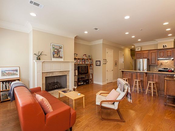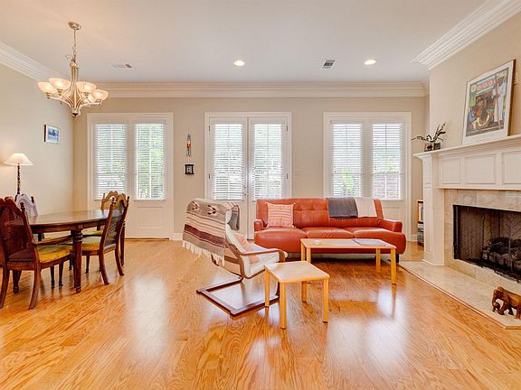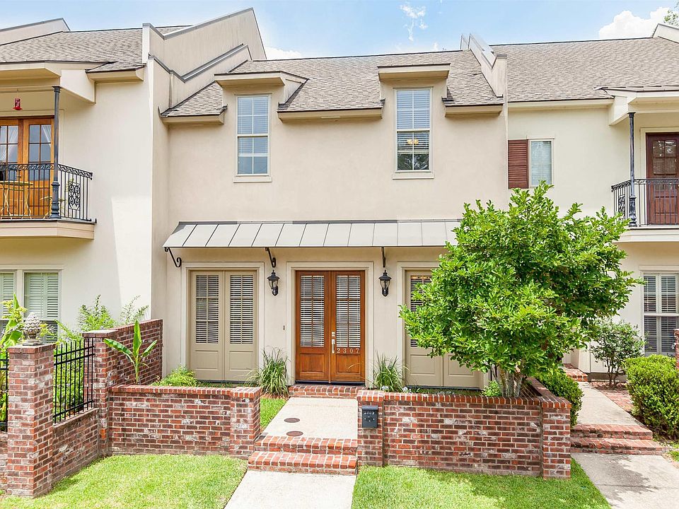 Fabulous townhome very close to LSU! This townhome features 10 ft ceilings with stacked crown molding, open floor plan, wood floors in living area and large fireplace with gas logs, and a wall of windows. Kitchen features granite counters & travertine backsplash, breakfast bar, gas range, pot filler, pantry, dishwasher, ceramic tile floor. Master bedroom located on the ground floor features wall of windows overlooking the lush green courtyard, carpeting, ceiling fan and ensuite bathroom with double-sinks, framed mirror, separate wet area with combo tub and shower, and large walk-in closet. Powder room is adjacent to the kitchen. Near the back door is a desk nook and laundry closet. Upstairs is a small carpeted den, hall bath with double-sinks and separate wet area with combo tub and shower, and two good-sized bedrooms with carpeting, walk-in closets, and ceiling fans. Back door exits to covered walkway to the 2-car garage and courtyard with path around the side of the garage to a gate that exits at the back. Professional drainage was added in 2019 as well as an irrigation system. There are four additional guest parking spaces in back shared by all the townhomes. There is a door from the neighbor's courtyard into this courtyard for fire safety so that they can get out through the gate to the back drive in an emergency. The LSU lakes are a very short walk down the street plus lots of restaurants and a grocery are right around the corner. Despite being close to the interstate, the owner, a classical musician, finds the home to be very quiet when inside. Additionally, a new wall to block sound is part of the current project when I-10 is widened in the next couple of years.