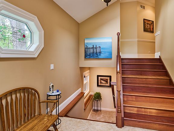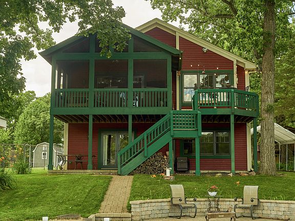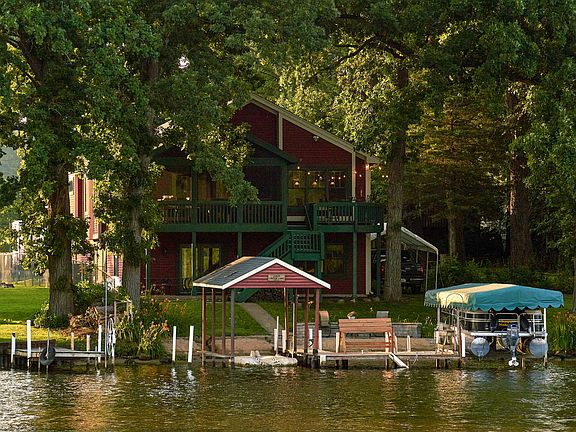 Lower Fox River home on 1/3+ acre with golf course views in the desirable Root Springs subdivision. Two Master bedroom suites, each with 2 large walk-in closets, and spacious master bathrooms with dual sinks and walk-in showers are perfect for over night guests. The third bedroom has an adjoining bath, for use as an additional private suite. Custom cherry cabinets and 6 panel cherry doors and stairs with Brazilian hardwood floors in the dining room. Skylights in the entryway and master bath. Front and rear stairways offer seamless flow and easy access between floors. Large deck with screened in porch for perfect river views on summer nights! Great room with vaulted ceilings, hardwood floor and fireplace is perfect for entertaining! The kitchen has extended cherry cabinetry, granite counter tops, and custom tile back-splash, complimenting the open floor plan and modern great room. The living room has a private side entrance and river facing French doors. Large laundry room is ready to convert to a kitchenette for possible in-law arrangement. Paver stone patio with a sandy beach is perfect for evening bonfires. The boat dock has 2 jet ski lifts and a pontoon lift included. Nine mature oaks trees provide cool shade in the summer. Exterior freshly painted in 2023. Well above flood plain, with no flood insurance required.