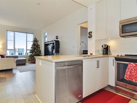 WELCOME TO MOSAIC Homes-FREMONT VILLAGE LIVING-Like New,Executive Style 'Atlin'Plan with Efficient Layout & Modern Appeal. Enjoy the Gourmet Kitchen with Light Cabinetry, Quartz Countertops & beautiful Hard Surface Flooring throughout.Plus 10' high ceilings. very Bright unit with lots of Natural Light. The living room has plenty of space for entertaining & provides access to the Large, Covered Balcony w/ South facing View.Both bedrooms are located on either side for Maximum Privacy & options. One Parking & One Storage Locker.Balance of 2/5/10 Home Warranty.Pets & Rentals Allowed.The exclusive Riverclub has a pool,gym, fitness studio,children's playroom, dog wash, bike wash and bike storage.Install an electrical outlet to charge your Electric Vehicle. Maint fee includes heating & hot water.