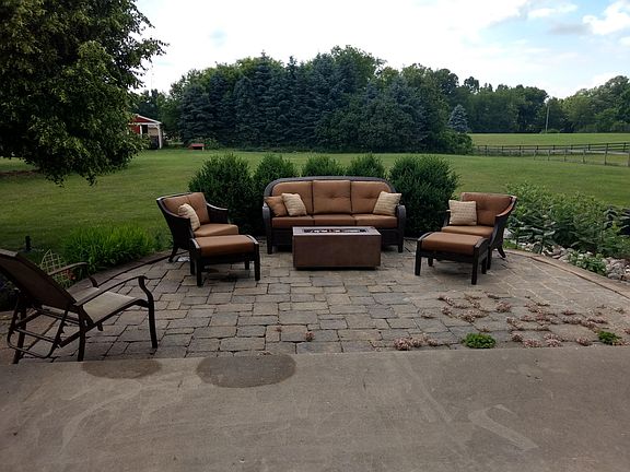 Peaceful and quiet. Sits 1/10 mile off road with many trees. Sit on the covered patio in complete privacy. Brazilian Cherry hardwood floors throughout. Updated master bath w/Jetted Tub and separate large shower. Vaulted ceiling with fan in Master Suite along with walk-in closet and second closet. Second and third bedroom have large closets. Covered front porch and covered side porch with step down tumbled brick paver patio. Back limestone patio overlooks gardens and rolling hills. Maintenance free exterior of Brick and Vinyl siding.