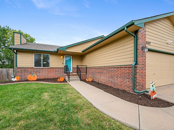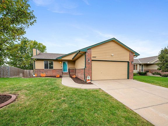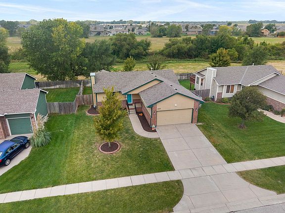 Welcome home to 2307 S Upland Hills St, in the highly desired Goddard school district. Pride of ownership is apparent in this very well maintained 3 bedroom, 3 bath home. This beautiful greenbelt property brings privacy and serenity along with amazing sunset views. An open floor plan, vaulted ceilings, neutral decor and a cozy gas log fireplace welcome you as you enter the front door. The kitchen overlooks the backyard and includes pull out drawers in the cabinets, an eating bar and is open to the dining area. The primary suite has a picturesque view of the private greenbelt and has an ensuite bath with dual vanities, shower, and walk in closet. A secondary bedroom, full bath, and laundry room finish out the main floor. The view out basement features a huge family room, oversized third bedroom, full bath and plenty of storage. The covered deck and fenced backyard offer a great space for outdoor enjoyment and entertaining! This awesome home is close to shopping, dining, and everything Wichita has to offer. Move-in ready and full of charm — this one won’t last long!