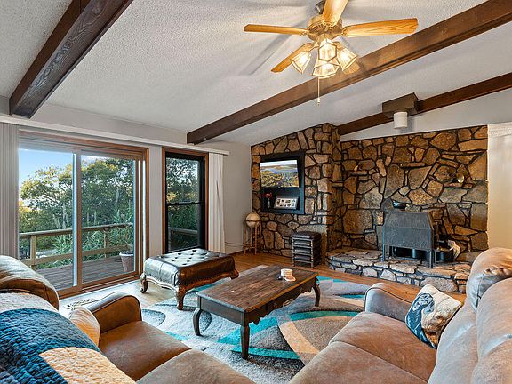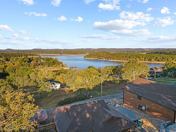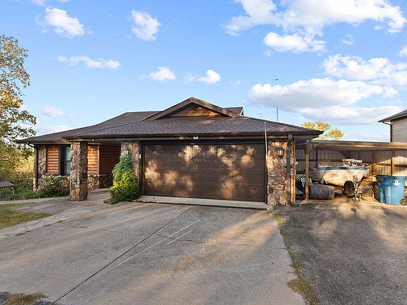 Enjoy sunsets over the lake from the large deck with gazebo and hot tub. 2 Bed/2 Bath lake house has a spacious living room with wood beams, large windows with lake view, and stone wall for wood stove. Kitchen is open to dining area and has new stainless steel refrigerator. One bathroom has been updated with large walk-in shower, and a laundry room has plenty of storage. The primary bedroom is spacious with attached bath and walk-in closet. The lower level with finished concrete floor is accessed from the outside and is great for storage or can be finished for extra living space. John Deere room on lower level. A 2 car attached garage plus attached carport and detached carport offer lots of vehicle storage. The property is 2 residential lots, and includes a large fenced area. The exterior features insulated vinyl log siding and natural Ozark stone. A 9x20 boat slip is available for $25,000.