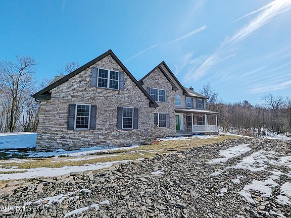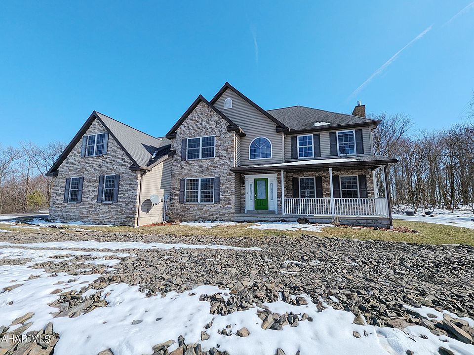 Large stone and vinyl 2 story Hollidaysburg area home on 16.49 private acres. First floor features formal living and dining rooms, large eat-in kitchen (cabinets missing) opens to spacious great room with vaulted ceiling and stone FP plus half bath and den. Second floor features 4 bedrooms including huge master suite with adjoining sitting area plus 2nd floor laundry. Large 3 car attached garage, rear patio. AS-IS sale. Seller will make no repairs. Buyer pays both transfer taxes. Photos are digitally enhanced.