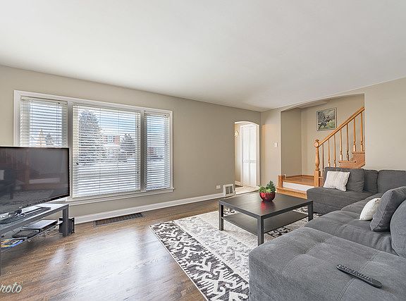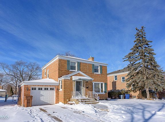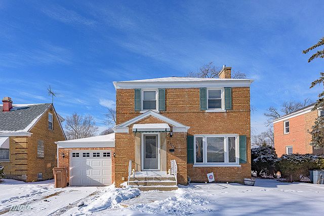 Beautiful brick 2 bedroom ,1 bath Georgian home in North Riverside . This sweet home features inviting living room, kitchen has maplewood cabinetry and center island w/stove. The dinning area has built-in corner shelves. Spacious master bedroom on the second floor. Full finished basement with laundry area and room to add 3rd bedroom. Hardwood floors, forced heat, central air & vinyl windows. Home sits on a double lot with the convenience of a side drive that leads to detached 2 car garage (garage 9 yrs new w/cemented rear pavement). Additional feature of attached 1 car garage with double door front and rear.Excellent for storage. You will love the large backyard.