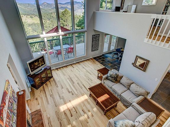 Privacy and stunning views of the Continental Divide with easy access to hiking and biking... and just minutes to I-70! This spacious mountain contemporary home sits near the end of the road with 400 acres of Rilliet open space to the west. Newly painted inside and out with gorgeous wood flooring throughout the living area and huge master suite. The open floor plan features a two-story great room with dramatic views; adjoining kitchen and breakfast area open to a large deck. Radiant heating in the living area provides winter warmth, and exterior solar shades help keep the home cool and shaded during warm afternoons. Semi-finished walkout basement provides a blank canvas - cozily heated by two fireplaces in the winter, a breezy solarium in the summer. Don't miss this unique opportunity - million dollar views just 20 minutes from Denver!