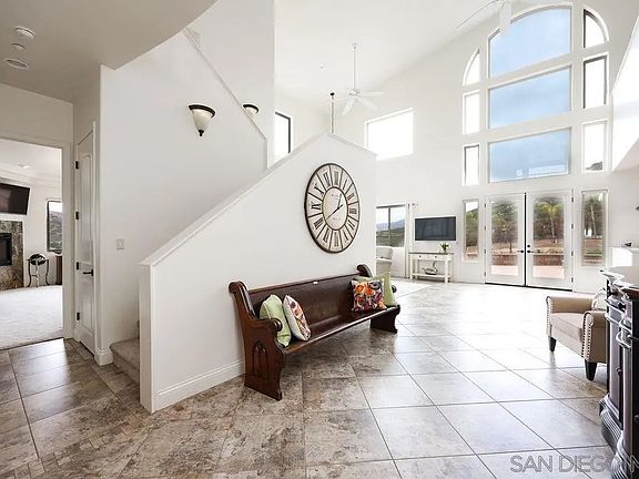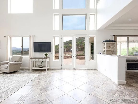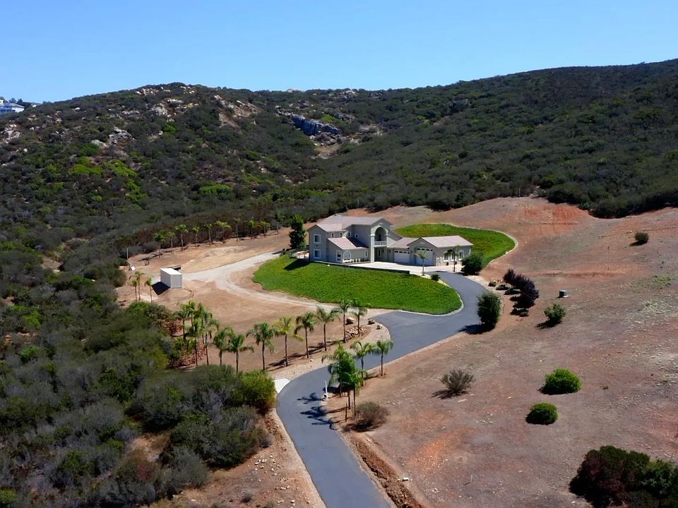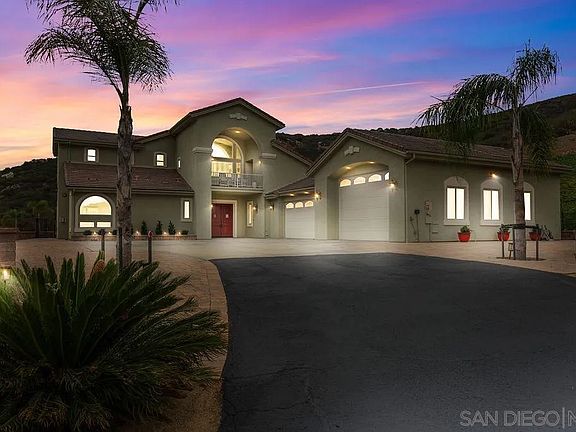 Incredible value, beautiful acreage with privacy and views from every window. Custom home with covered patio - swim spa and outdoor entertaining area - room for swimming pool - useable space - Palm trees - fruit trees - pavers- fenced in yard.Soaring ceilings, walls of windows, coffered ceilings in most rooms. Owned Solar & NO HOA’s or Mello Roo’s Keep costs down. The home boasts 3 spacious bedrooms (two with en-suites downstairs), formal living and dining rooms, balcony office and a spacious family room with adjacent area for study or currently being used as an additional bedroom. The primary bedroom is spacious, with fireplace, has a massive walk-in closet, expansive bathroom with separate soaking tub from shower and dual sinks. The kitchen is designed for entertaining with stainless steel appliances, double oven, built in microwave, center island, cherry cabinetry, slab granite counter tops with accent tiles as backsplash. Serine views from every window, back yard, and balcony to enjoy and revive your soul. Outside you will be in tune with nature with a large paver patio & retaining walls (portion of which is covered), immediate fenced rear yard and a total of 4.95 acres to enjoy. Well services the irrigation of the grounds, city water services the home and owned solar to keep the costs down. 6 car garage is finished, has office with built in desk, work areas with storage and has a high bay for tall vehicles. 45 minutes to Airport, beaches, Mexico or desert. Geico, Amazon Distribution Center and General Dynamics is 25 minutes away. Many Bio Tech companies 30-45 min away.