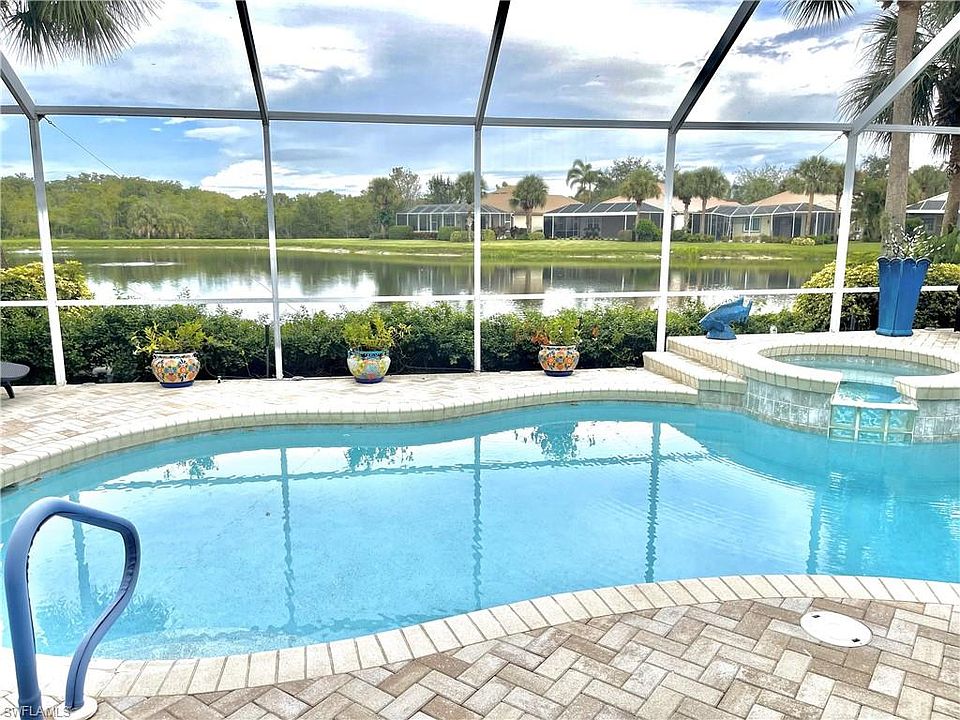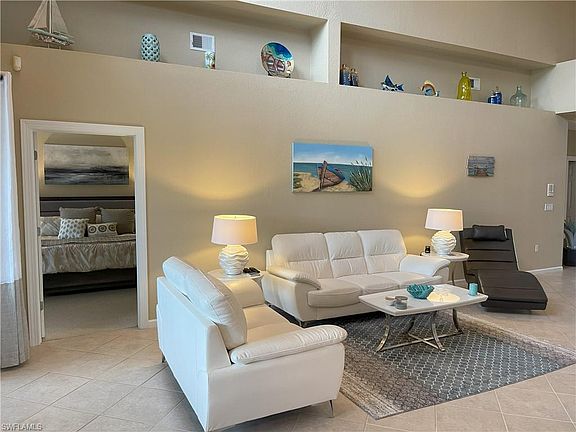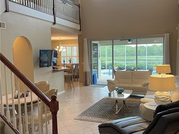 Discover tranquility in this 2-story lakefront pool home within Shadow Wood's coveted gated enclave. Fabulous serene lake setting for this spacious 3 bed + Den + Loft home where you will enjoy beautiful sunrises & water birds. No cart path, golf course equipment or road noise nearby to disturb your peaceful setting. Soaring ceilings accentuate the open living area and seamlessly blend the indoor and outdoor spaces. The spacious kitchen overlooks the living area and offers granite countertops, stainless-steel appliances, breakfast bar and separate dining area. The screened, covered and pavered lanai offers a perfect outdoor area to entertain, dine al fresco or enjoy the heated pool and spa all while enjoying the lush landscaping and tranquil water views. Spacious 1st floor master with his & hers closets, king bed, en-suite Roman tub and walk-in shower. Two roomy upstairs bedrooms have queen beds and a flex/loft space. The downstairs den/office can double as a 4th bedroom and offers a sleeper sofa. Live the Florida lifestyle to the fullest in this tranquil escape! Gold Membership available w/transfer fee. Rented January through April, 2025.
