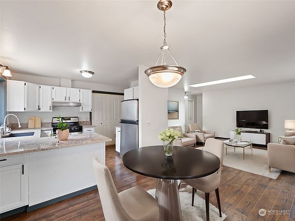 This beautifully updated home offers an inviting open-concept layout with laminate flooring throughout the living, dining, and kitchen areas. Abundant natural light pours in through a picture window and skylight. The remodeled kitchen features white shaker cabinets and stainless steel appliances. Bedrooms boast newer carpet, and the home is enhanced with chair rail accents and fully trimmed windows and doors. Enjoy the fully fenced backyard with a spacious deck, perfect for entertaining. Conveniently located near town, state parks, and the Anacortes trailhead.