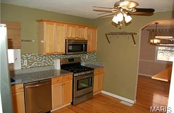 This ranch home is move in ready with everything a buyer could ask for! Recently updated kitchen with upgraded stainless steel appliances including gas range, microwave, dishwasher and refrigerator (frig is negotiable), granite countertops, new cabinet with crown molding, and back splash. Newer wood floors throughout family room, living room, dining room, hall and kitchen. All main level bedrooms have newer carpeting. Newer water heater, siding, windows, roof, furnace, A/C replaced in 2005. Finished walk out basement features a large rec room, bar area, possible 5th large bedroom, play area and half bath. Walk out of the basement or main level to beautiful level fenced yard. Some other great features of this home are, built in bookshelves, wet bar, bay/box window, gas fireplace in family room, walk in closets, wood six panel doors, attic fan, extra storage and workshop in over sized garage. Come see this well kept home today!