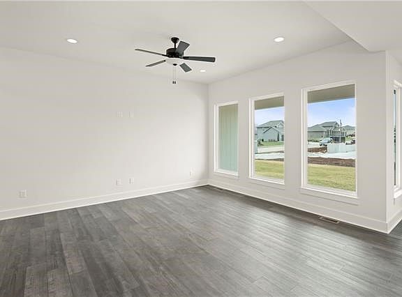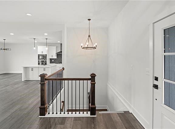 Home is scheduled to be complete on 3-4-2022. The current pictures are of a home we just closed. This Reverse Ranch has 3 bedrooms and 2 full baths on the main level. It has a daylight lower level and can be finished with a 4th bedroom, full bath, wet bar and large rec room. Nice sized kitchen with a huge walk-in pantry, custom cabinets, large breakfast bar with cabinets on both sides of island and barstool seating. Granite counter-tops and stainless appliances as well. The kitchen and dining room area have 9 foot ceilings and 10 foot in the living room. The dining room is right off the kitchen and it has a sliding glass door that leads out to a covered deck with a treed view. Nice sized master en-suite includes a vaulted ceiling and a barn door that leads into the bath area. It includes double vanities, large tiled walk-in shower with a regular shower hear plus a rain head shower as well. The walk-in closet will also take you into the laundry room. Two generous sized secondary bedrooms that include ceiling fans. Oversized 3 car garage that includes openers. The yard is fully sodded as well. Builder has other lots available in the subdivision with many other floor plans to choose from. The subdivision is master-planned for 186 homes and includes a Community Lake with Walking Trails that lead into Harrisonville City Park, lake and the Harrisonville Golf Club. 2022-02-24