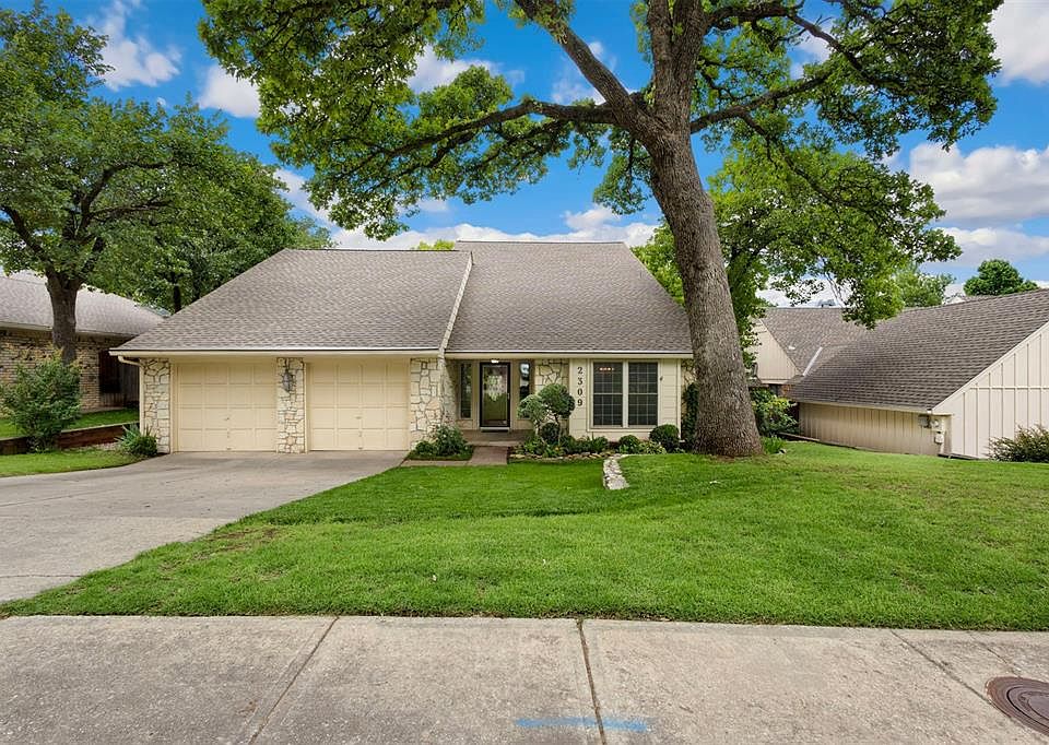 Welcome to 2309 Colchester Drive in Chimney Hill - a neighborhood known for its wooded lots, meandering creek, park access and strong sense of community. This 1.5-story home offers over 2,300 square feet with three bedrooms, two and a half baths, and a flexible layout. The main living area is spacious and inviting, centered around a stone fireplace with large windows that frame views of the private backyard. It flows right onto the back deck, making it perfect for indoor-outdoor living and entertaining. The kitchen features double ovens, great storage, and a breakfast nook, and there’s a formal dining room for gatherings.