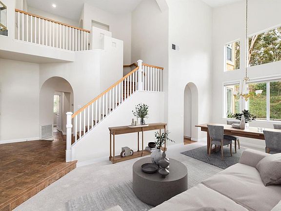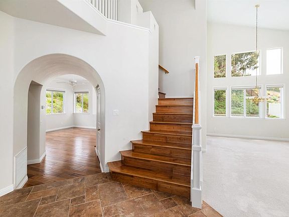 Remarkable Carlsbad home in the exclusive enclave of Eagle Canyon at Evans Point! Expansive 0.32-acre corner lot. Situated on a quiet cul-de-sac street w/ no rear neighbors, this charming craftsman-style house offers privacy & comfortable sophistication w/ its idyllic location & refined open interior. Curb appeal exudes from lush landscaping & inviting walkway that meanders to the front porch & double-door entry. Once inside, you are greeted by a freshly painted interior & soaring 2-story ceilings with multiple double stacked windows, and an abundance of natural light working to create a brilliant atmosphere in the formal living room & designated dining room. Arched cased openings & hardwood floors define the open-concept kitchen & family room offering an expansive feel w/ a spacious high-end feel. Delightful eat-in kitchen equipped w/ double ovens, walk-in pantry & island w/ bar seating. The extended breakfast nook extends the comforts of the interior outdoors to a more alfresco setting through French doors. Surrounded by vast windows & accented by a handsome brick fireplace, the family room offers an inviting space for relaxation & entertainment. Main-level half BA & laundry room. Upstairs features new carpet throughout. Palatial primary suite w/ vaulted ceilings, large picture windows, extended seating area & spa-quality BA w/ dual sinks, soaking tub, walk-in shower & oversized walk-in closet. Down the hall, 3 generously sized BRs share a full BA w/ double sinks. The expansive backyard offers complete privacy with open woods behind & unlimited potential for you to develop the ultimate entertainer’s dream space. Prime location near everything Carlsbad has to offer! Minutes to walking paths & trails, award-winning schools, beaches, shopping & more. To see it is to love it!