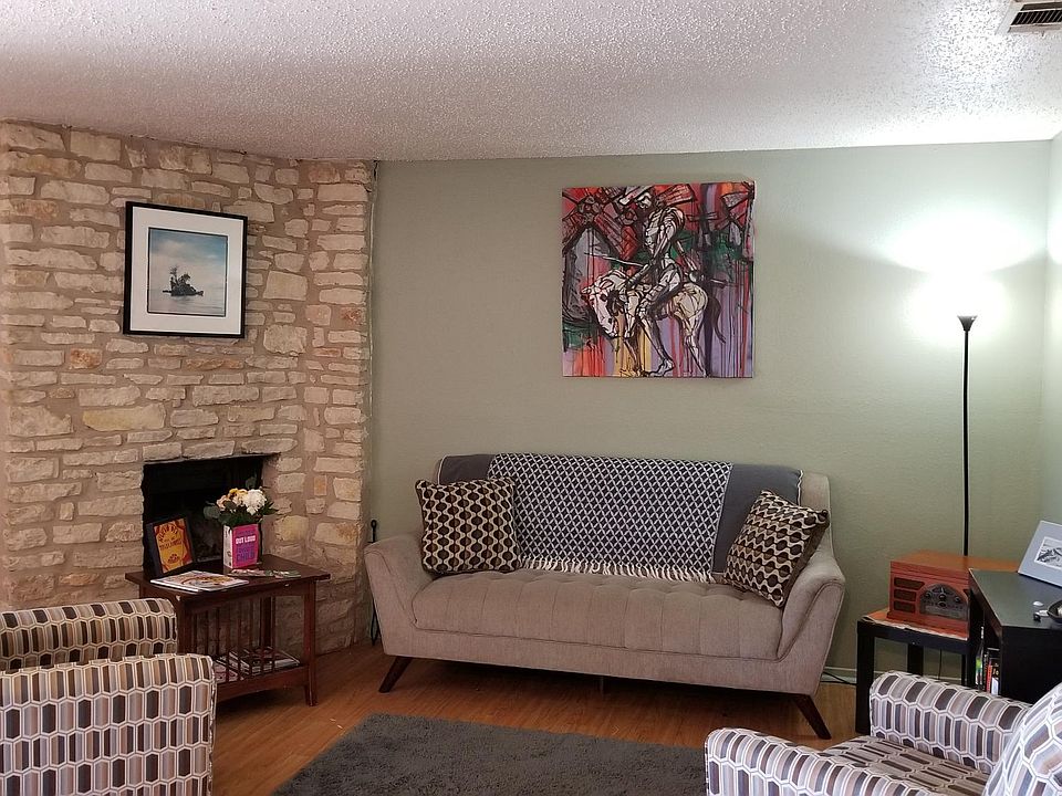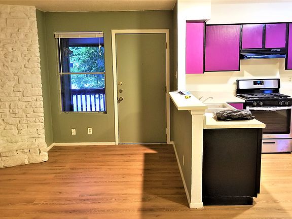 Clean, light and bright. Unit is in excellent condition. New paint through out. Light oak colored plank vinyl flooring. Up Stairs Unit in the trees, Two Bedrooms, One Bath. Garden Window, Stone Fireplace, Ceiling Fans, Garden Window in Kitchen, Full size Washer & Dryer hook-ups inside unit, Gas Heat, Gas Cooking, Refrigerator, upgraded Stove and Dishwasher. Private Deck/Patio (Front and Back). Individual Storage Unit. Neighbors are all long term. Short Walk to HEB, Bus Stop, Shopping. Large space for the price. Call to set up a showing. Renter pays for Electric, water and gas. No smoking inside apartment. Small pets considered allowed. Past rent history a must. Call if interested.
