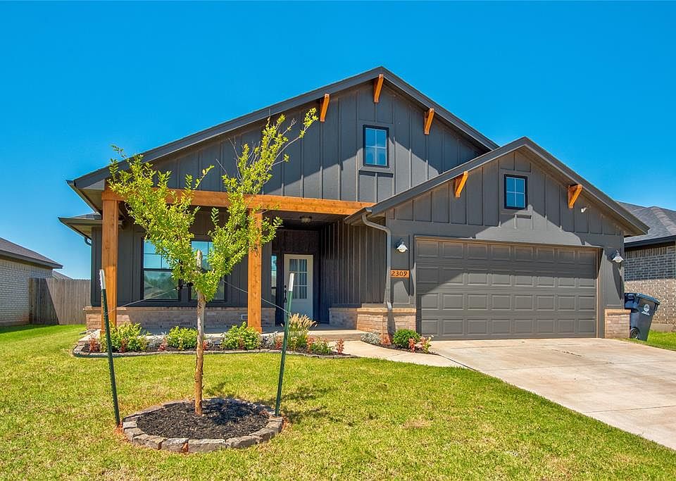 Don't miss this home in Valencia with beautiful curb appeal showcasing brand new landscaping and cedar accents popping against the dark exterior! As you enter the home there is a built-in hall tree to your right and open concept living space ahead. Kitchen has a beautiful mix of floating shelving and cabinets, breakfast bar, quartz counters, pantry, water filter installed under the kitchen sink, and gas stove. Primary suite has a walk-in closet, walk-in shower (Glass door & trim are at home but were never installed, buyer could install if preferred), double vanities, separate tub and private toilet area. Other amenities added to this home include: dusk to dawn front lights (some are motion activated), all new LED lights were installed throughout the home 1 year ago, myQ garage door opener, Vivint security system to stay including all exterior cameras, and 10 person storm shelter!! Neighborhood has multiple playgrounds, splash pad, baseball diamond, volleyball court, basketball court and walking trails/paths.