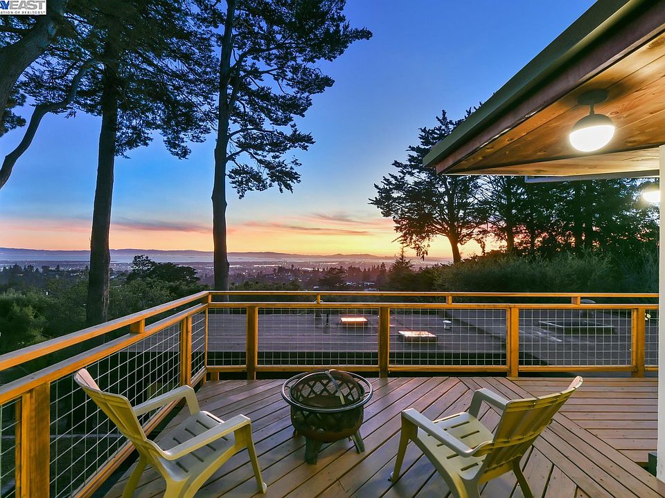 With sweeping bay views and multiple private level yard areas, 2309 Thackeray is an exquisitely remodeled mid-century 5BR/3BA home resting on +/- 1/2 acre, gorgeously situated in a sublime setting. The 3048 SQFT home (+ 617 add’l SQFT of bonus) offers a unique flexible compound w/custom landscaping, ample space for creativity, a potential ADU & the possibility for further development of its large lot. Completed in the last 2 yrs, the home is rich w/artisan woodwork, new flooring & modern paneling–a nod to Mondrian and Finish styles of the mid-20th century. The sunny living area w/fireplace flows from reception to dining, living, and kitchen, all with stunning views of bridges & city skylines. A wrap-around porch adds seamless indoor/outdoor living: multiple patios, gardens, & level lawns for play, contemplation & dining. 2 bedrooms and bath are upstairs. Downstairs holds 3 more bedrooms, 2 full baths, living area w/fireplace plus a giant multi-use space for laundry, storage or home gym. A 2-rm primary suite has ADU potential w/its separate entrance, chic bathroom, bay views, bonus rm & private garden. The lot extends to the street below and 5 off-street parking leads to the 2-car garage at the front. Near Montclair Village, public & private schools, and miles of regional parks.