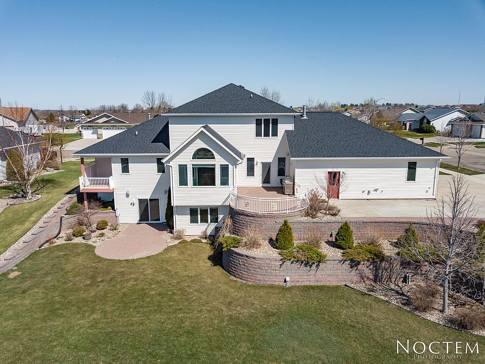 This grand custom built 5 bedroom 5,300+ sqft home with amazing views is waiting for a new family. The kitchen is made for a chef with high end appliances, granite counters, and a large dining room with a walkout to the elevated back paver patio. The living room has 20+ft high ceilings with a two sided fireplace and a sunroom surrounded by windows overlooking an amazing view. Also on the main floor is office/mud room off the garage, laundry room with sink, full bathroom, 2nd bedroom and the master suite. The master suite offers walks out to a private deck, walkin closet, and the master bath with heated tile floors, whirlpool tub, double vanities, and shower. The upper level has the 3rd and 4th bedrooms, full bathroom, and a loft overlooking the main level living room. The sprawling lower level features heated floors, a 5th bedroom with an on-suite 3/4 bathroom, 2 family rooms, walkout to the lower level patio, 1/2 bath, and a tiered theater room. The over sized 3 stall garage has heated floors and a 1/2 bathroom. The exterior has steel siding, new shingles in 2018, RV pad with electrical hookups, yard shed with overhead door, and beautiful landscaping. Additionally each room has surround sound speakers and controls. This home is grand and built with care. Call an agent today.