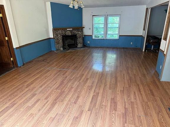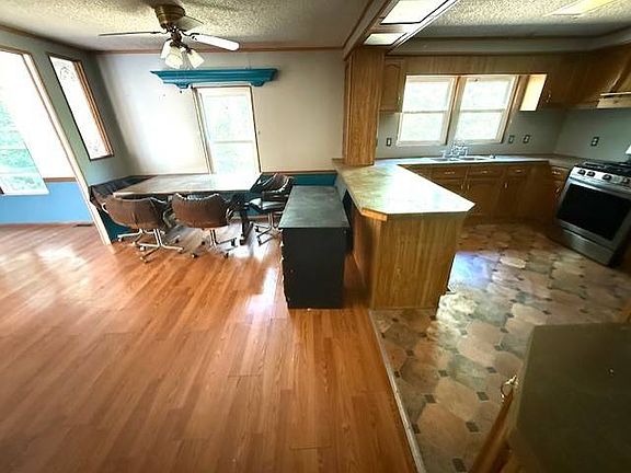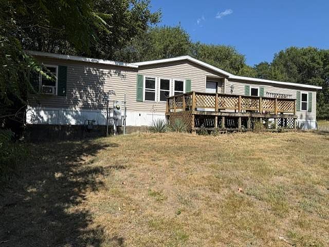 If you are a HANDYMAN, this home could be your forever home with various REPAIRS. Entrance: Large wood deck opens to living room. Living Room: Large room has laminate floor, cathedral ceiling, corner fireplace (converted to electric) white with blue wainscot walls. Dining Room: Adjacent to living room, kitchen continuous decor as living room, laminate floor, white with blue wainscot. Some part of the floor has soft spots here. Kitchen: Oak cabinets, laminate counter top, snack bar to dining room. Vinyl floor, stove and refrigerator included. Some spots in floor have been wet and need underlayment. Laundry: Water heater was leaking and tenants did not notify. ENTIRE FLOOR in laundry has been WET and needs REPLACED with plywood underlayment. On the bright side, new water heater. Master Bedroom: Laminate floor, one wall painted cream, 3 painted navy. Large walk in closet. Private bath with laminate floor, garden tub. Bedroom: Laminate floor, light blue walls, closet, some soft spots on floor here. Bath: Vinyl floor, cream fixtures, teal green walls. Bedroom: Laminate floor, blue walls. Large cement slab for future garage or carport. The main repairs due for this house are the in the underlayment. Manufactured homes do not use plywood underlayment. They use particle board, so any time the floor gets wet the underlayment will disintegrate. Metal undercarriage is still STRONG, new plywood is required for repair. The primary area is in the laundry room, but it has also saturated part of the kitchen floor as well. Some bedroom windows have been left open during a rain and floors are spongy in this area too.