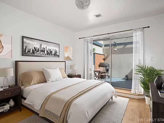 Upon entering the foyer on the upper level, the northeast facing floor to ceiling windows and skylights flood sunlight into the living/dining area. Also, on this level is the primary bedroom with its custom closet, two exposures and sliding glass doors exiting to your own private refuge a private patio. The patio has high walls that provide you with privacy. The bedroom enjoys easy access to a full bathroom. The sleek kitchen is both large and well appointed with stainless steel appliances.