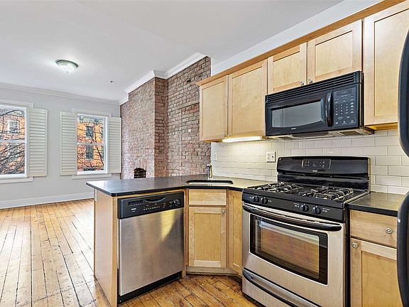 Sun-drenched 1 bedroom 1 bath condo located in Downtown Jersey City. This beautifully maintained 2nd fl unit features central AC, original pine hardwood floors, exposed brick walls, a spacious living room area and a modern kitchen with stainless steel appliance and granite countertops, eat in breakfast bar. Added features include bedroom with 2 large closets, an additional private storage and washer/dryer in the basement. Open backyard space ideal for summer. Great location less than 5 mins to Grove St PATH, restaurants, light rail, to NYC. Don't wait to set up a showing!