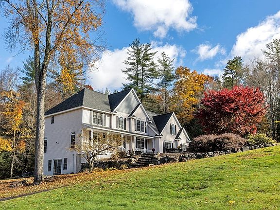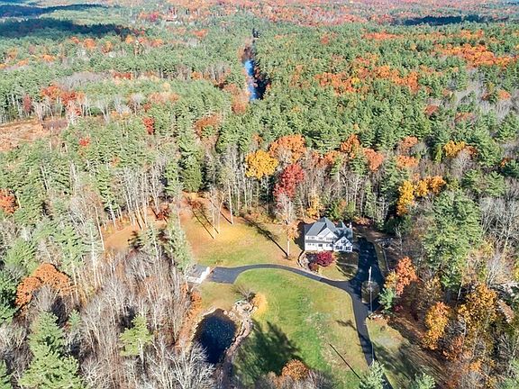 Unique wilderness Colonial, 10 min. from all amenities, features 4 bedrooms, 5 bathrooms and sits on a private 8.5 ac lot with 400+ ft, Souhegan river frontage w/dock for fishing and kayaking. Private pond with bass & trout with brick walkway, pagoda & firepit. Lighted fence, professional grade tennis/basketball court. First floor office, hardwood floors, eat-in, tiled, kitchen overlooking great room with wood fireplace and back deck access. Formal dining and living room, two staircases, 4 large bedrooms and second office. The large primary bedroom has trey ceiling and separate vaulted sitting room for 3rd potential office, workout, nursery, sewing etc. area. Tiled PB bath w/shower and jacuzzi & double vanity w/faux marble. Second PB bedroom with full bath. Walk out finished LL family room & bedroom/office, w/full bath & potential in law. Property has private trail and access to conservation bike trail, new roof, newly paved driveway, 1 detached garage, large shed & more.
