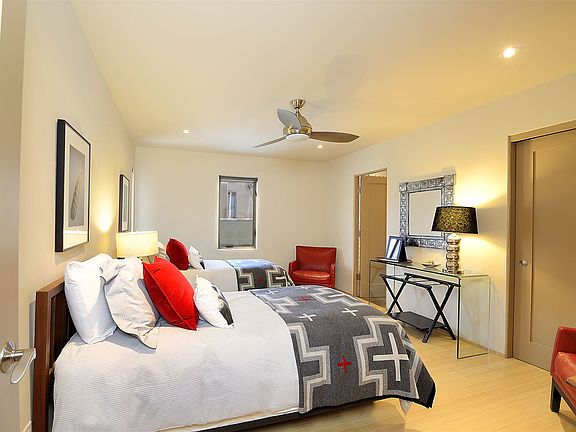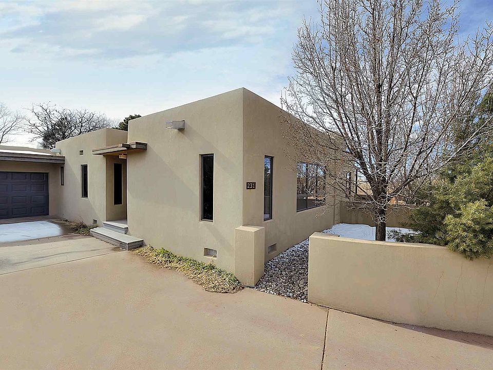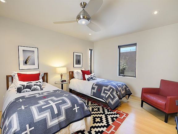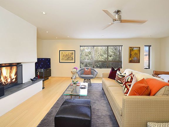 Walk to the Plaza from this gorgeous architecturally designed contemporary home by renowned designer Susan Trowbridge. Clean lines and thoughtful spaces abound this 2 bedroom, 2 bathroom home featuring a wonderful separate studio with bathroom, central ac in the main house - mini split in the studio, wall washing skylights, upscale appliances, a one car garage, drip irrigation, mature trees, a beautiful courtyard and landscaping - all one level! This turn key home is a rare find in the coveted plaza area and not to be missed.