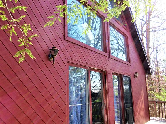 Snuggled-in-nature Chalet w/fabulous view of the surrounding valley! Wrap around deck, beautiful open 1st floor living room, dining area, modern kitchen plus 2 bedrooms, laundry area and full bath. Spiral staircase to master bedroom suite with loft, walk in closet & balcony deck, full bath!! Lower level family room w/beautiful stone fireplace & powder room! Newer roof, grinder pump & water heate