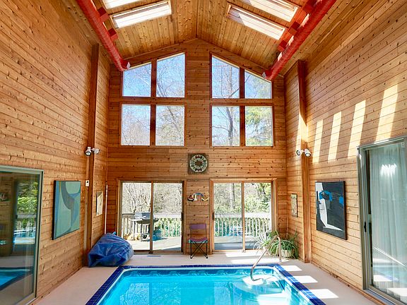 SPECTACULAR CUSTOM DESIGNED HOME WITH AN INDOOR SWIMMING POOL FOR YEAR ROUND ENJOYMENT!! A FULL CEILING OF SKYLIGHTS, SET ON A PRIVATE 3 ACRES. Nestled in the Rhododendron is this EXQUISITE home with a center home featured INDOOR SWIMMING POOL and a full ceiling of SKYLIGHTS!!! This LOVELY home has a SUNKEN LIVING room with River Rock stone wood burning fireplace, Cathedral ceilings, Central Vac, Central AC, 2 Car Garage, wrap around deck, circular driveway, and more. This home is in Immaculate condition sitting on a private wooded 3 Acres. This Expansive ranch is on a full basement just waiting to be finished off into more BEDROOMS! This beautiful home comes furnished! Close to all the Poconos Attractions, great commuter location. Perfect home and location for A Vacation RENTAL.