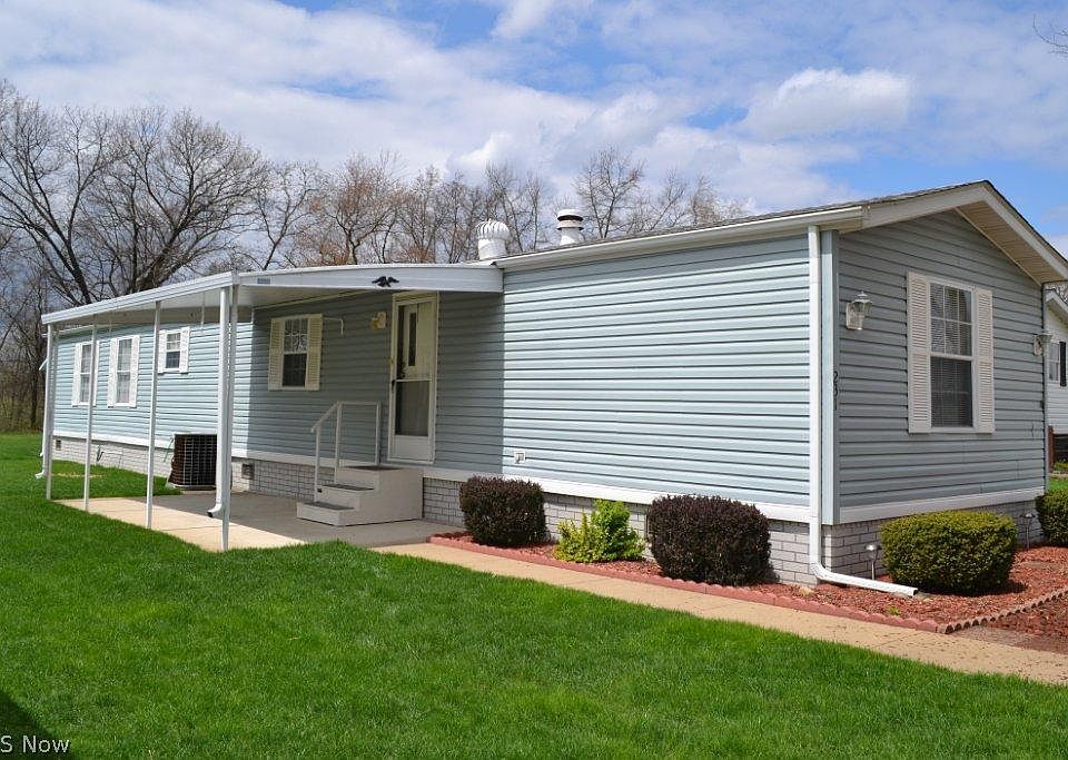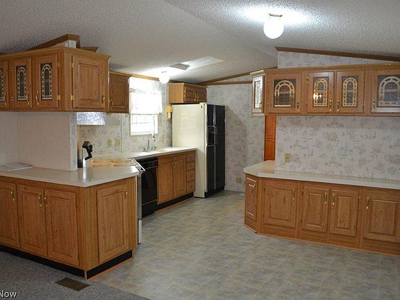 Perfectly situated 14 x 70 Skyline Spruce Ridge mobile home, built in 1993, on a high bluff overlooking the Towpath and woods in Navarre Village. Very clean, light and bright and in move-in condition. Two bedrooms with two full baths. Master Suite has walk-in closet, and bath has shower with seat. Large, fully applianced kitchen with newer flooring and light cabinets. Laundry room with washer and dryer. Newer carpet in living room and master bedroom. Ceiling fans in both bedrooms. Carport for two cars on one side and covered patio on other side. Newer insulated skirting in 2012. 10 x 10 Storage Shed. Navarre Village is a 55+ Community.
